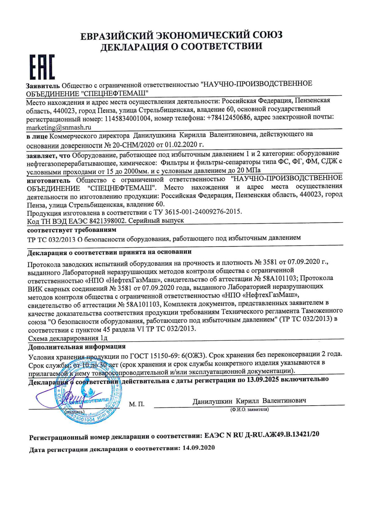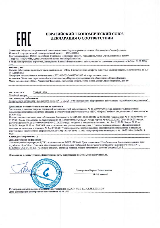 Декларация о соответствии ТР ТС 032/2013 - Адсорберы