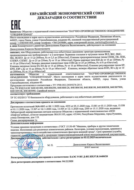 Декларация о соответствии ТР ТС 032/2013. Арматура