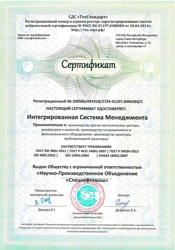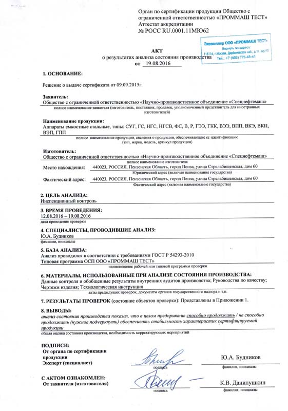 Сертификат соответствия ТР ТС 032/2013 - Сепарационное оборудование типа НГС, ГС, ФС, НГСВ