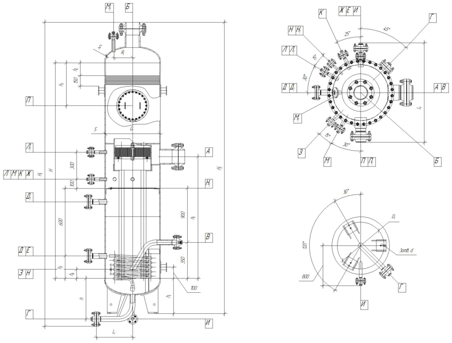 Обозначение Назначение Размеры в зависимости от объёма аппарата А Вход газа 150–350 Б Выход газа 150–350 В Выход конденсата 50–100 Г Дренаж 50 Д Уровнеметр 50 Е Термометр по запросу Ж Термопреобразователь 50/М20х1,5 З Вход теплоносителя 20–25 И Выход теплоносителя 20–25 К Для манометра М20х1,5; Ду 50 Л Отбор давления 50 М Дифманометра по запросу Н Указатель уровня 15–50 П Люк 100–450 -
